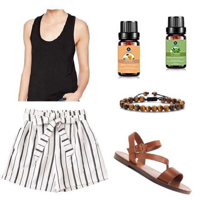 This week’s look is monochrome. I picked out white paperbag shorts with black stripes, a black tank top, leather sandals, and a diffuser bracelet. The cool thing about the bracelet is that you can use it to diffuse essential oils.